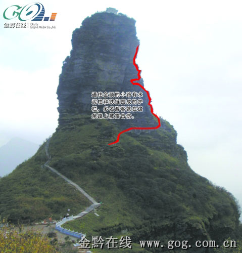 據(jù)劉先生介紹,當天在下雨,上午他們一行8人坐索道到了山上后,就分成了兩組。劉先生等6人從剛修通不久的木棧道去蘑菇石景區(qū)游覽,而同行的賴先生則與另一伙伴去攀登金頂。